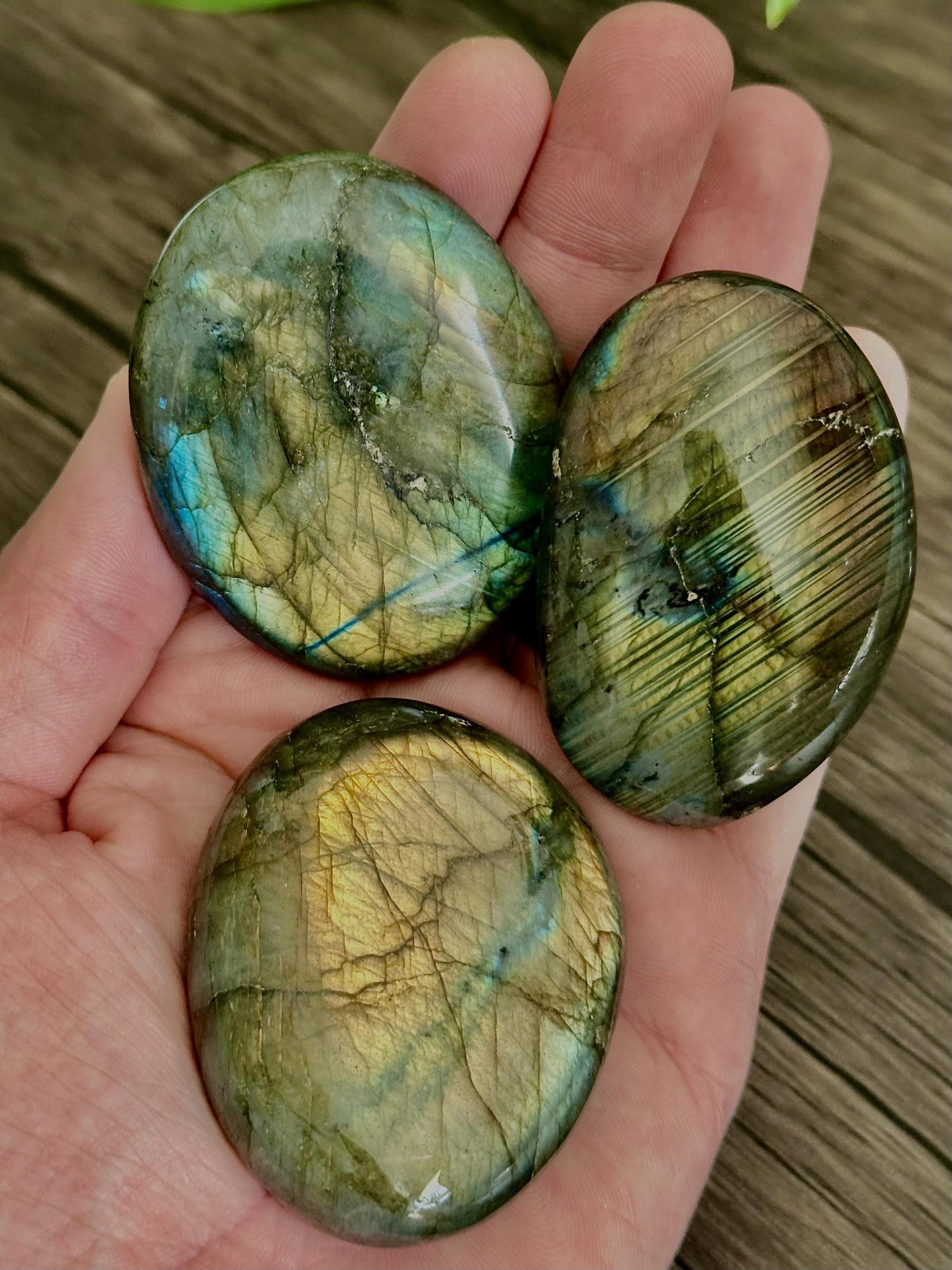 Labradorite palm stones offer protective and intuitive support in a compact form. Variations may include standard flash, gold flash, higher-grade material, or smaller sizes.